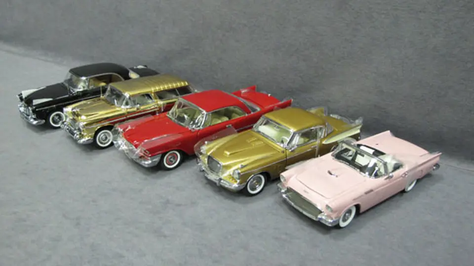 Five (5) 1/24 Scale Danbury Mint Cars - 1957 Ford Thunderbird New in Box, 1957 Studebaker Golden Hawk New in Box, 1958 Chrysler 300D New in Box, 1955 Chevy Nomad New in Box, 1956 Chrysler 300B New in Box.