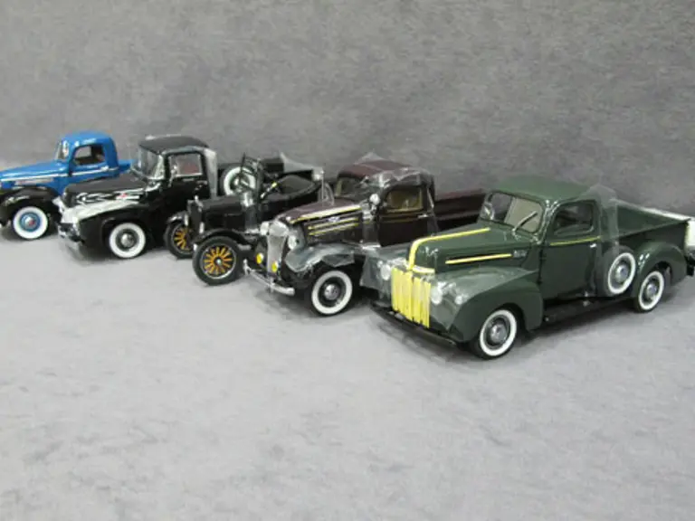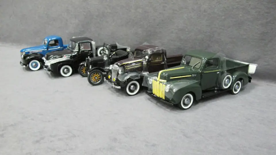 Five (5) 1/24 Scale Danbury Mint Cars - 1942 Ford Pickup New in Box, 1937 Chevrolet Pickup New in Box, 1925 Ford Model T Runabout New in Box, 1956 Black Ford F-100 Pickup New in Box, 1941 Chevrolet Pickup New in Box.