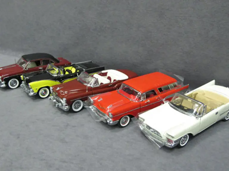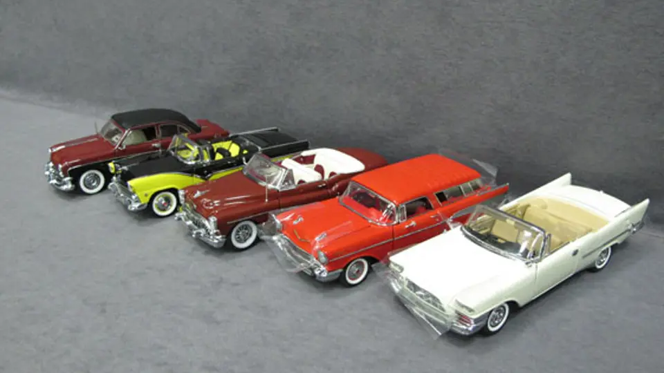 Five (5) 1/24 Scale Danbury Mint Cars - 1957 Chrysler 300 C New in Box, 1957 Chevrolet Bel Air Nomad New in Box, Red 1953 Buick Skylark New in Box, 1955 Ford Fairlane Sunliner New in Box, 1950 Ford Crestliner New in Box.