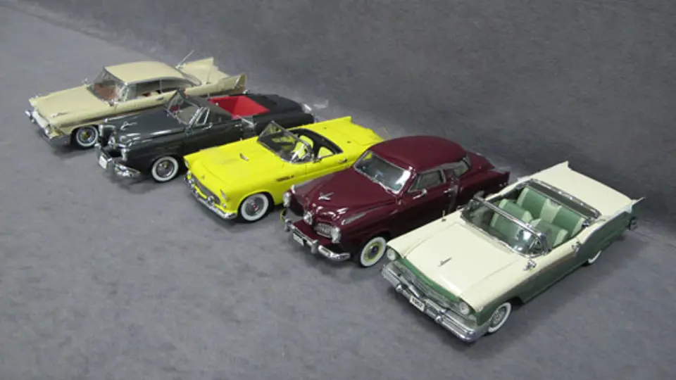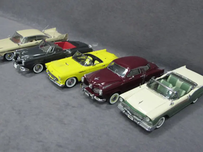 Five (5) 1/24 Scale Danbury Mint Cars - 1957 Ford Fairlane 500 Skyliner New in Box, 1951 Studebaker Commander Coupe New in Box, 1955 Ford Thunderbird New in Box, 1950 Studebaker Champion Convertible New in Box, 1958 Plymouth Fury New in Box.