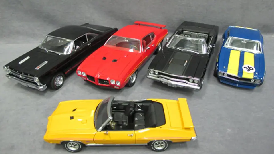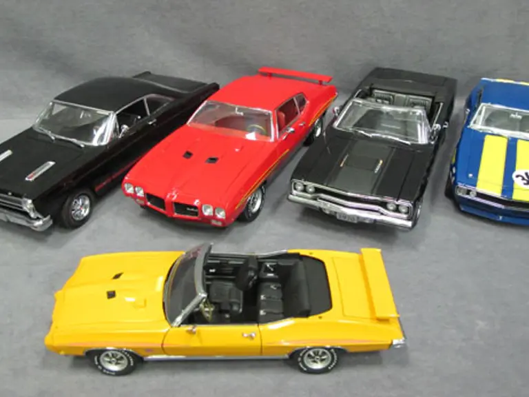 Four (4) 1/18 Scale and One (1) 1/24 Scale GMP Die-Cast Cars - 1967 Chevrolet Camaro Z28, 1970 Plymouth Road Runner, 1970 Pontiac GTO Judge, 1969 Ford Fairlane 390, 1/24 Scale 1970 Pontiac GTO Judge Convertible New in Box.