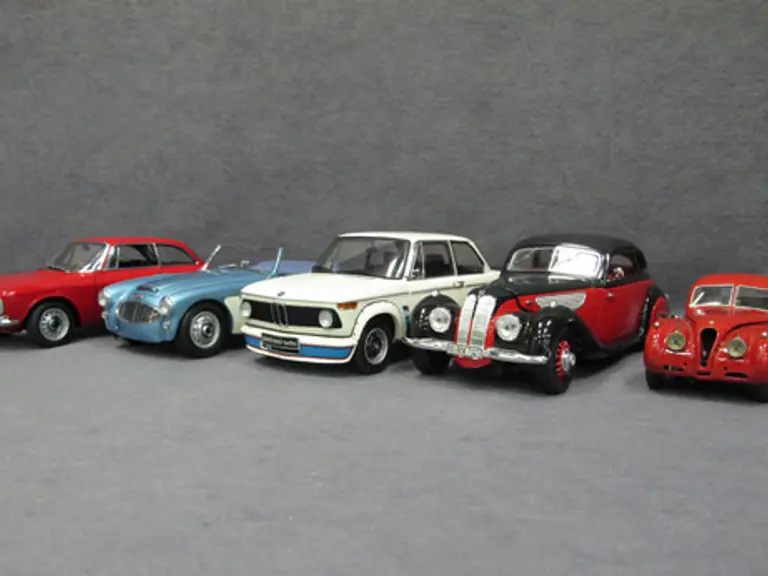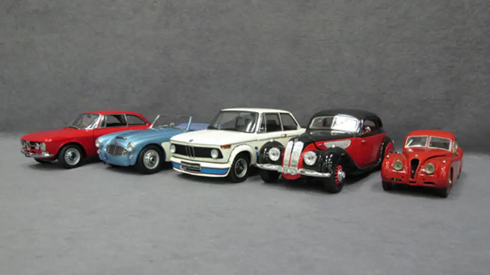 Five (5) Assorted Scale Model Cars - 1/24 Scale WM Jaguar XK120, 1/18 Scale Gui Toy 1930's BMW Coupe, 1/18 Scale Kyosho 2002 BMW Turbo, 1/18 Scale Kyosho Autin Healey Convertible, 1/18 Scale Auto Art Alfa Romeo 1750.
