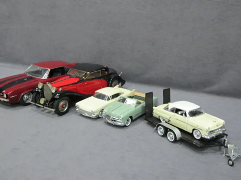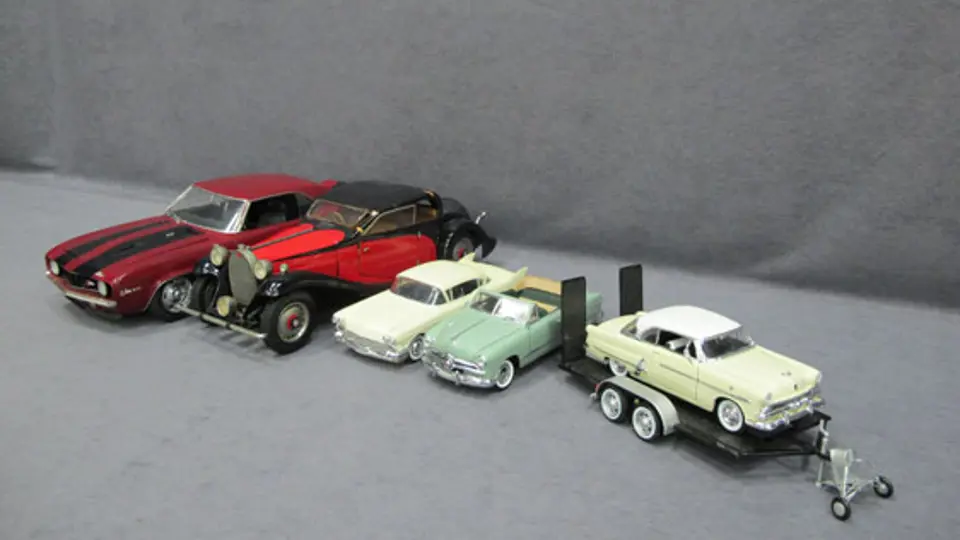 Five (5) Assorted Scale Model Cars - 1/24 Scale Franklin Mint 1949 Ford Convertible, 1/24 Scale 1958 Fleetwood Cadillac, 1/24 Scale Welly 1953 Ford Victoria with Trailer, 1/12 Scale 1930's Bugatti, 1/12 Scale 1969 Chevrolet Camaro Z28.