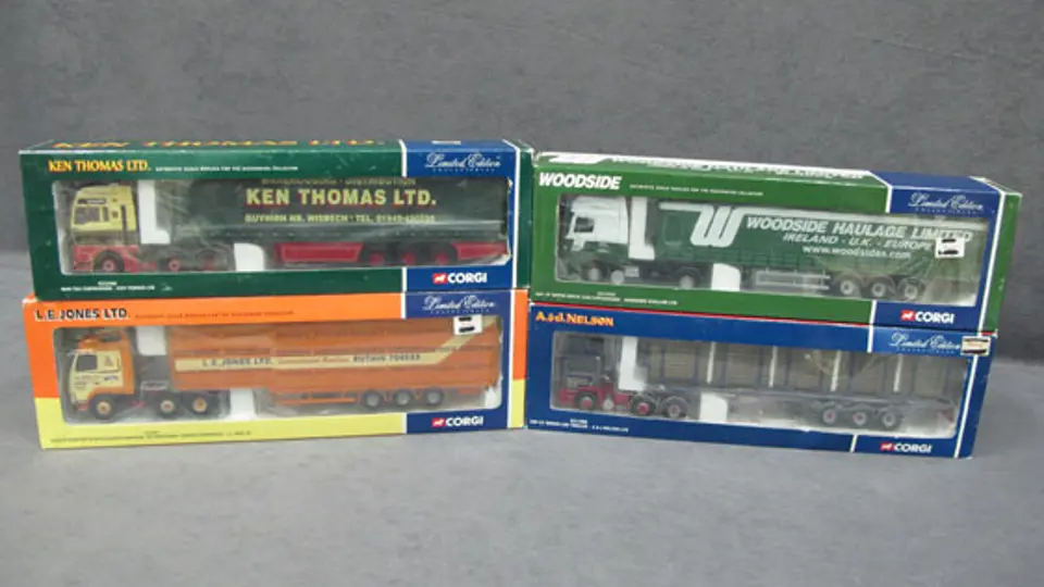 Four (4) 1/50 Scale Corgi Classics Trucks - Man TGA Curtainside Ken Thomas LTD, Volvo FH Globetrotter with Houghton Parkhouse, 'The Professional' Livestock Transporter LE Jones LTD, DAFXF Super Space Cab Curtainside Woodside Haulage LTD