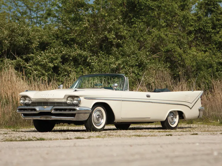 1959 was to all intents and purposes the last year for DeSoto as an independent marque. More importantly, it was the final year for convertible Desotos. This example is particularly impressive and appears to be completely original other than a single repaint and top replacement. The chrome still sparkles and the body is straight. Underhood its presentation and appearance is consistent with the rest of the car, clean, sharp and unrestored. It has an automatic transmission, power steering, wide bias-ply whitewall tires, hubcaps, radio, dual rear antennas and a blue vinyl power top with matching boot cover. It evidences its long history with a single owner where it obviously was loved and treated to sympathetic, continuous care as needed. Pieces like this are rarely found, even less rarely in such a rare model as the 1959 DeSoto Firesweep convertible, one of only 596 built in this last year of DeSotos convertible body style.