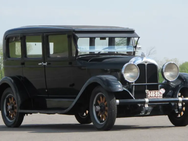 The 1928 Auburn Model 76SD Sedan seen here is equipped with a 185-cid, 60-hp Lycoming inline six-cylinder engine and three-speed manual transmission. Riding on a 120-inch wheelbase, the car is mostly original except for an older repaint, and features wooden artillery wheels with two rear-mounted spare tires. Showing only 49,632 miles on the odometer, the car has a 50-year ownership in the same family and is fitted with an accessory heater and electric fuel pump. This large, five-passenger sedan features Auburn’s unique “widows-peak” design treatment flowing from the radiator cap through the body’s lower beltline.