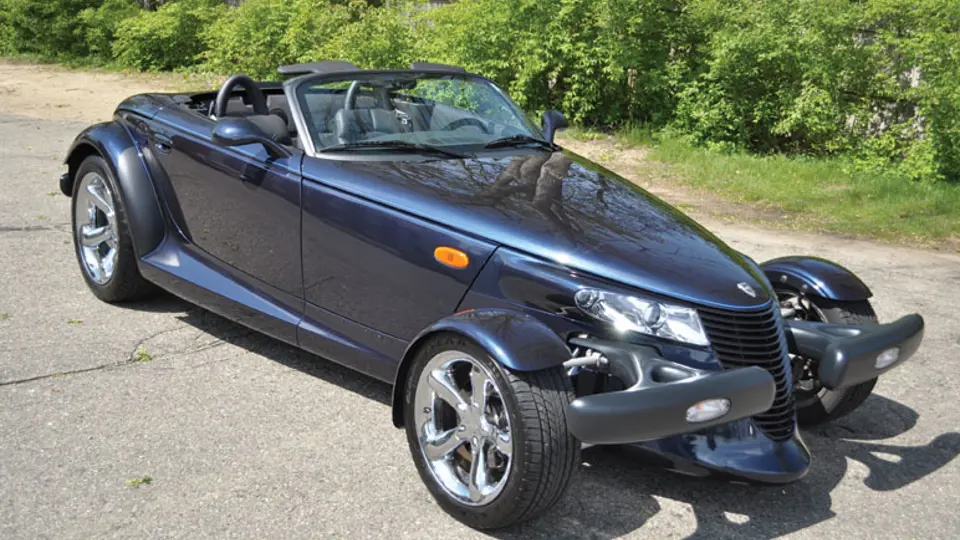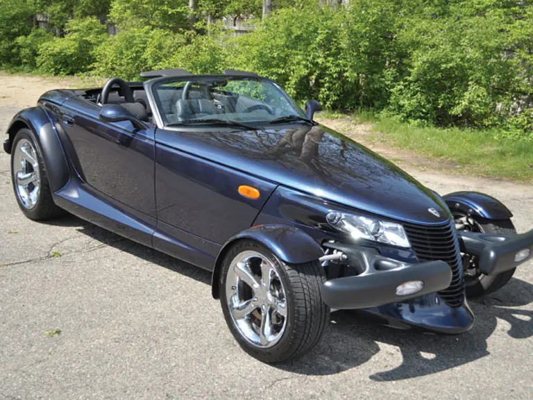 This 1,950 mile 2001 Chrysler Prowler Mulholland Edition features a 3.5-litre V-6 engine rated at 253-hp and is backed by an autostick automatic transmission. The Midnight Blue Pearl is unique to this edition and displays light blue pinstripes and leather interior. This car has been smoke-free and has power windows and door locks, as well as an AM/FM/CD multi-disc changer. Additional equipment includes power seats, air conditioning, front reading and courtesy lamps, dual airbags, fixed head restraints and manual dark blue soft top with glass rear window. Also found on the Prowler are chrome five-spoke alloy wheels, stainless steel dual exhaust with chrome tailpipes, power rack-and-pinion steering and vented four-wheel disc brakes.