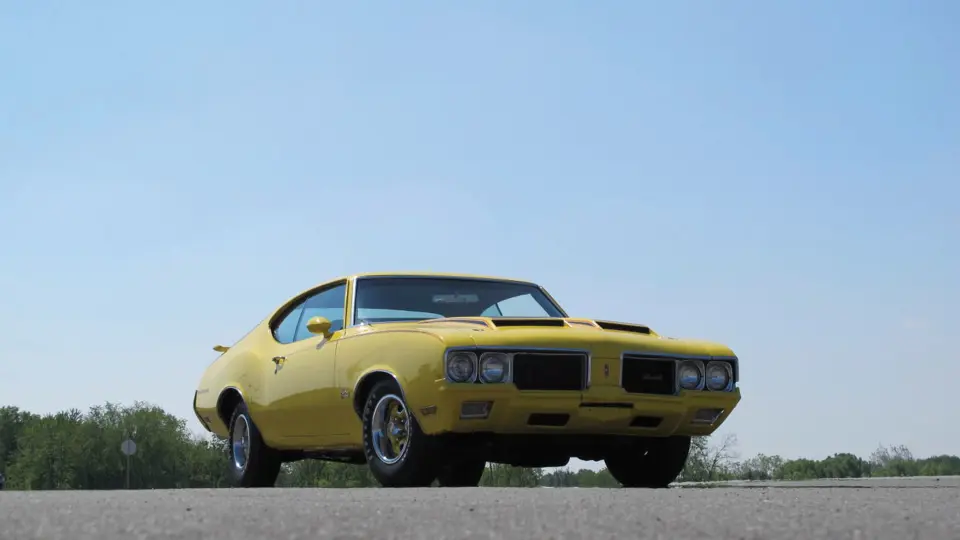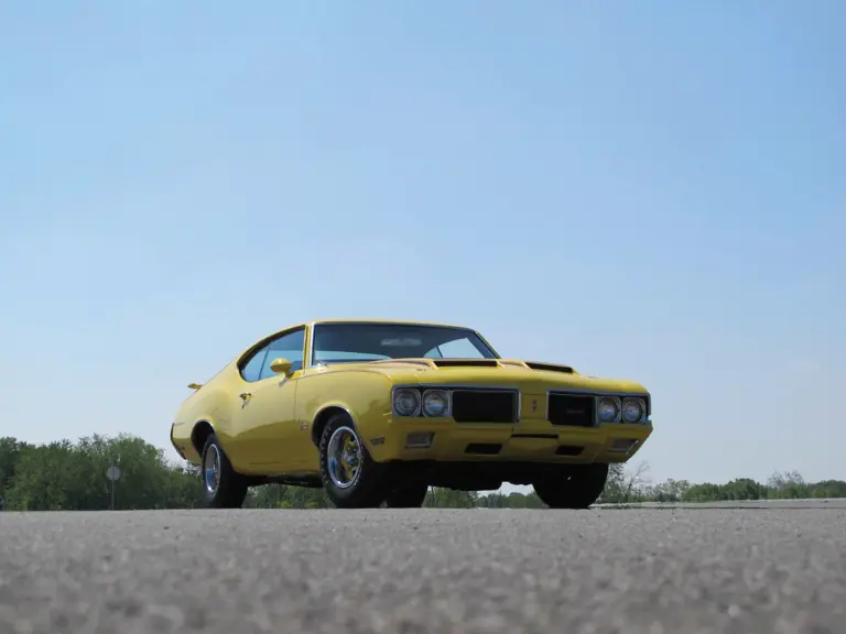 This 1970 Oldsmobile Cutlass Rallye 350 features a 350-cid Rocket V-8 engine and automatic transmission. This quite uncommon Rallye 350 Edition (option package W-45) has been rotisserie restored; it is reported that only 3,547 copies of this model were produced. Power steering and power disc brakes are included, as are bucket seats and a console. The hood is the induction version to feed air from the fiberglass Dual Air hood vents to the four-barrel carburetor efficiently, helping to produce 310-hp. The distinctive rear-deck spoiler helps handling characteristics, as do 7.5-inch wheels mounting wide oval tires. The Rallye 350 also displays the, unique to this model, yellow bumpers. Even when new, it is reported numerous owners wanted these dealer replaced with the chrome version.