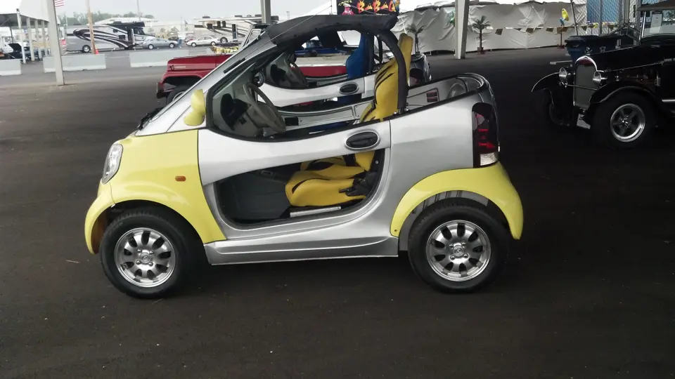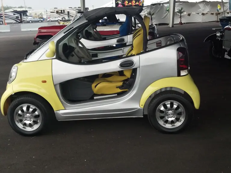 This yellow and silver two-tone 2009 Kandi Coco electric car can go approximately 60 miles on a charge, and it can attain a top speed of 38 miles per hour. The Kandi Coco has turn signals, lights, alloy wheels and a AM/FM/MP3 stereo system. This Kandi has a built-in charger that plugs into any 110-volt outlet. It is street legal and comes with a title. This example has its "Title in Transit."