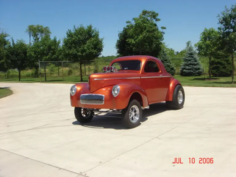 This 1941 Willys Gasser uses a body made by Outlaw: the body is made of fiberglass and mounts over one whale of a supercharged V-8 engine to provide drag racing power, while also allowing for power windows and power brakes. The blower draws its air from above the hood, through a carefully cut and finished opening. All moldings are stainless steel. The front axle is straight and chromed while the interior features custom leather upholstery. This is a custom hot rod/drag car that offers comfort as well as extreme power.