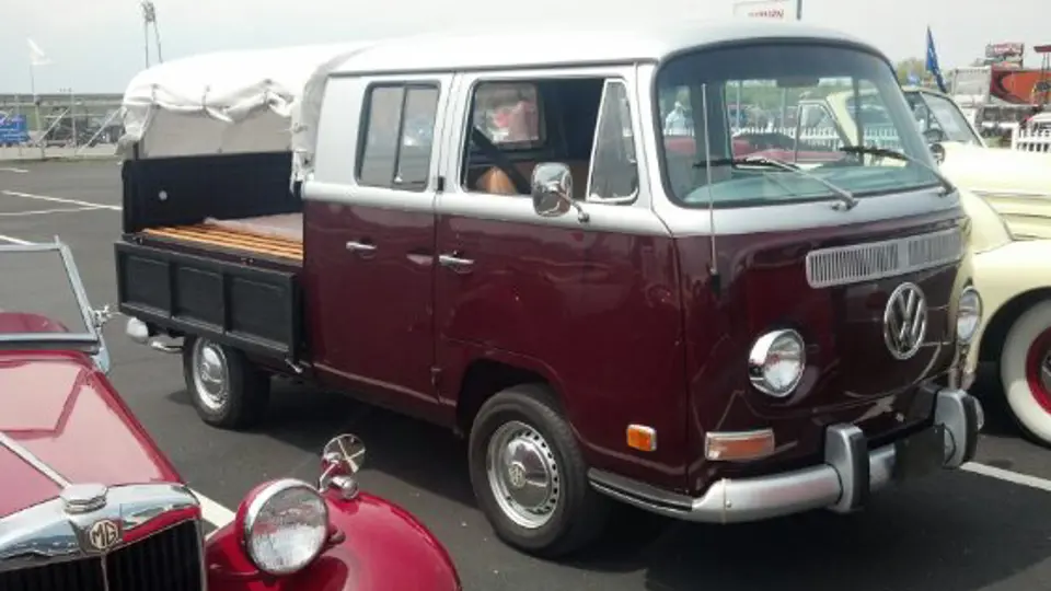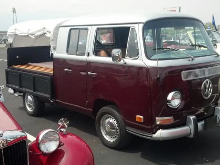 A very rare VW light-duty truck, due to tax speculations between the United States and Germany. Very few were brought to America; imported trucks were drastically curtailed. This show-quality example is one of a handful available. This Volkswagen Type II model with correct 1.6-liter engine had a professional rotisserie-type restoration in California. All new leather interior with cranberry and silver paint, all new paint in the bed and interior drop gates, and all restored wood slats in the bed. New two-pillar canopy with slot-top and canvas enclosure. First place show winner, 11th annual VW show "Bay window bus". It runs and drives like brand new.