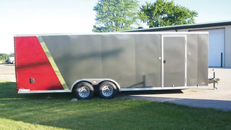 With overall dimensions of 24-feet by 8.5-feet, this Cargo Express trailer has 5,200-lb axles, radial tires, wedge-nose with tapper, triple tongue and four D-rings with 5,000-lb capacity. The floor is made from 3/4-inch thick material and the white walls and ceiling are mounted on 16-inch centers. A 36-inch side door, 48-inch escape door and LED lights are also found on this nicely built gray and burgundy enclosed trailer. It is accompanied by a three-year limited warranty.