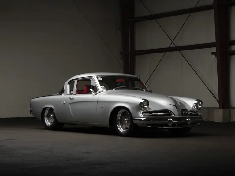 Featuring a custom silver exterior, it has a red leather interior featuring bucket seats, center console and custom dash. Power is supplied by a V-8 engine and automatic transmission. In addition, this “Stude” has power windows, CD player, dual mirrors, tilt steering, detailed engine bay and custom wheels in the similar style of period Halibrands.