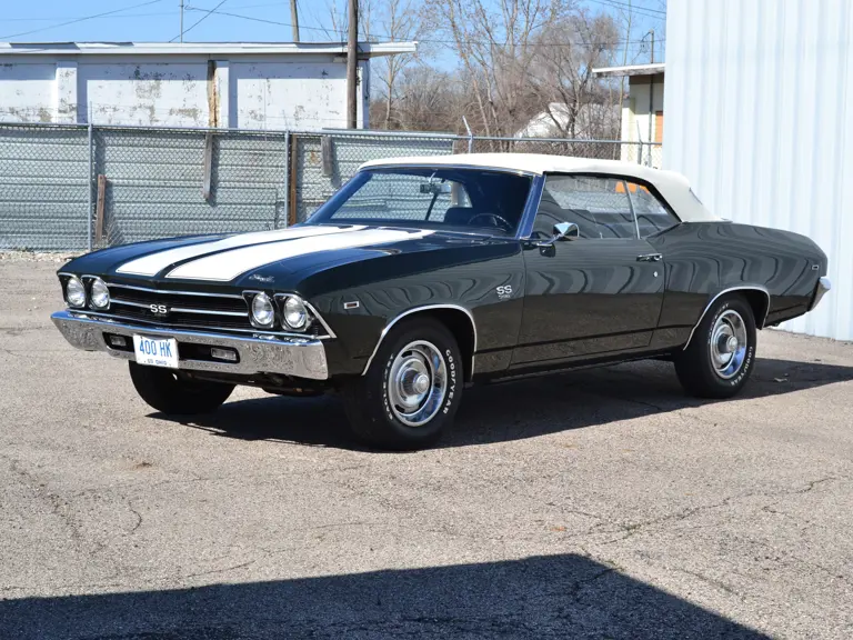 This 1969 Chevrolet Chevelle SS 396 had a body-on restoration completed in 2016. The car is presented in green with white racing stripes and a new white top. The owner describes the paint as show quality. The Chevelle is powered by a 396-cid, 350-hp V-8 engine which is paired to a four-speed manual transmission. The engine block is reported as original and according to one source, there were 12,454 Chevelles built in 1969 with the 396-cid V-8 and manual transmission. The power is sent to a 12-bolt rear with 4.10:1 gears. Power options on the car include a power top, steering and brakes. The interior is completed in black with bucket seats and new carpet, door panels and weather strips. Additional interior features include gauge package with tachometer, console and AM/FM radio.