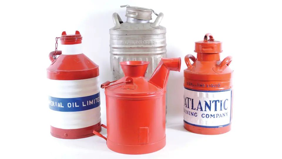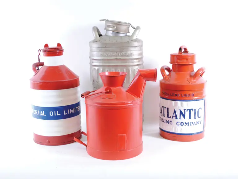 Three have been repainted on original embossed branding. Comprised of an Atlantic, Imperial, and Standard, together with an original condition 10-gallon Sunoco can.