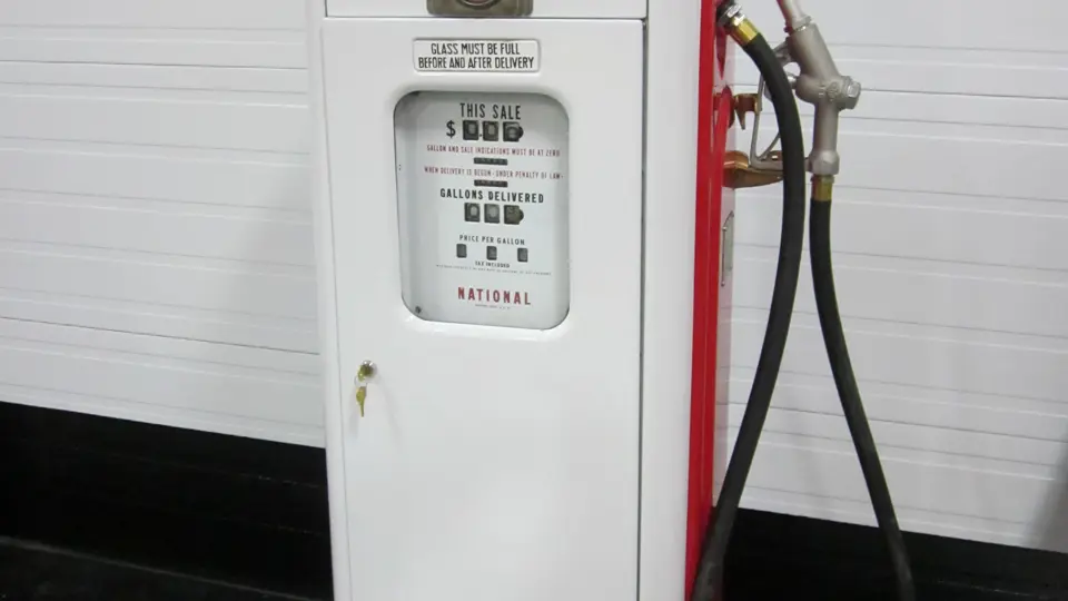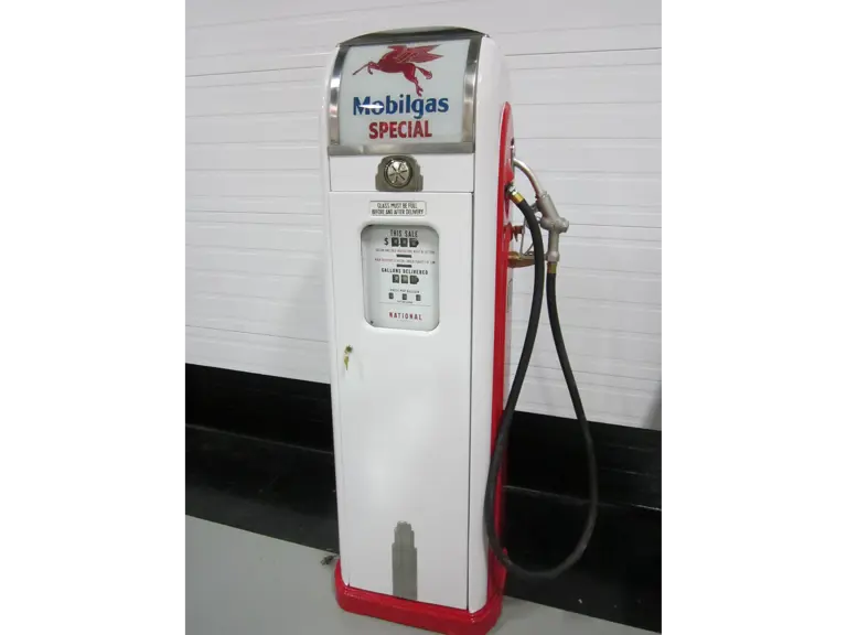 Restored National A38 gas pump, finished in red and white.