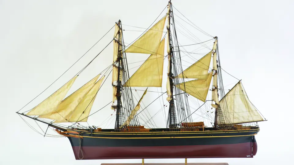 highly detailed wood and fabric model of the famous Victoria clipper build in Scotland in 1869, with carved figurehead, planked deck, lifeboats, bow rails, cabins and hatches.