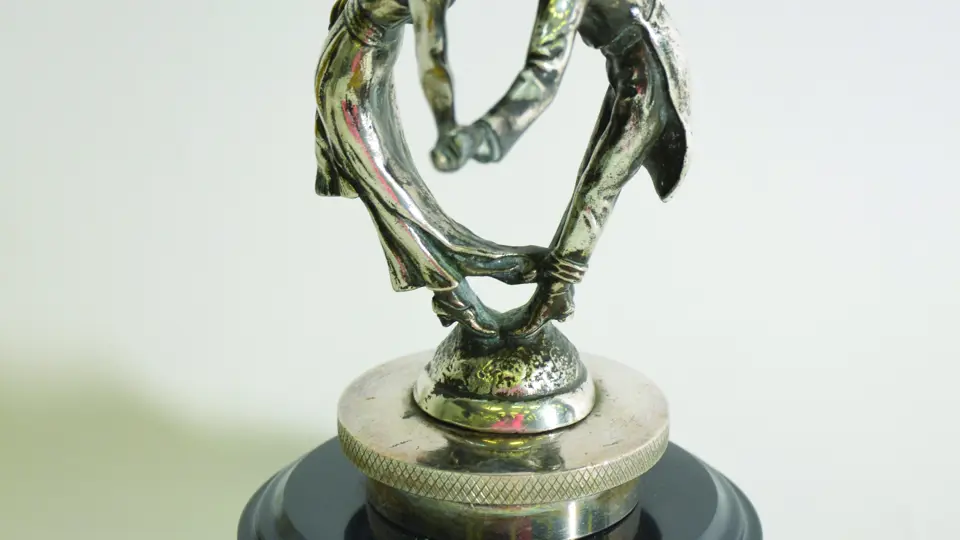 Nickel-silver plated bronze, depicts two dancers mounted on integrated cap.