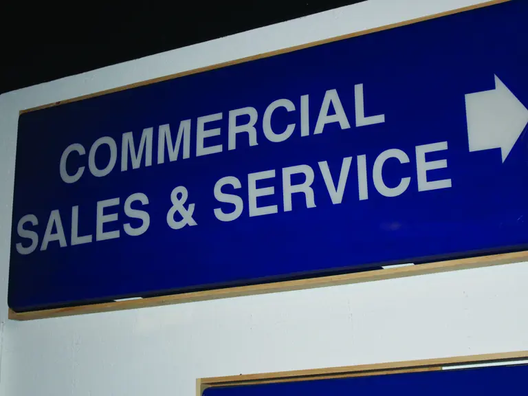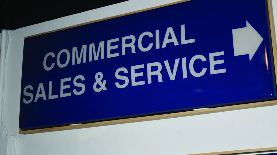 A Ford, "Service" and "Commercial Sales And Service," illumintated signs.