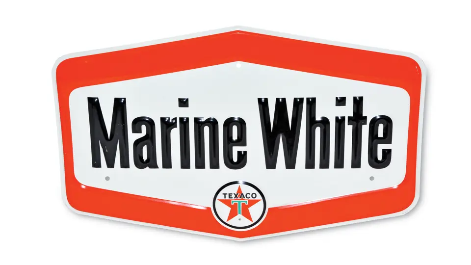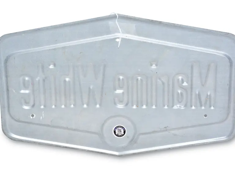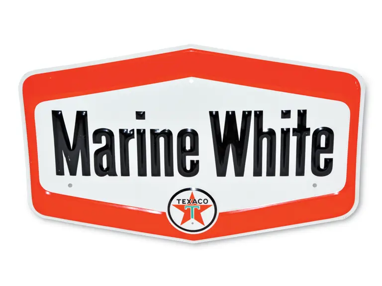 This die cut embossed SST sign has excellent shine and color. It has light marks at one mounting hole.