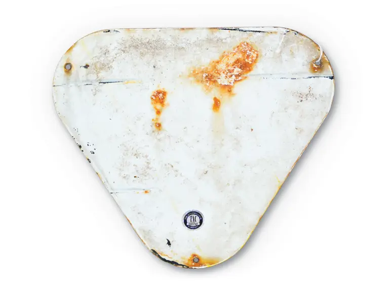 This die cut SSP sign has excellent gloss and color. The field is clean with tiny chips around the perimeter.