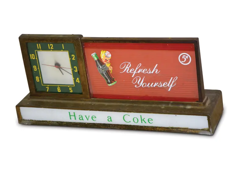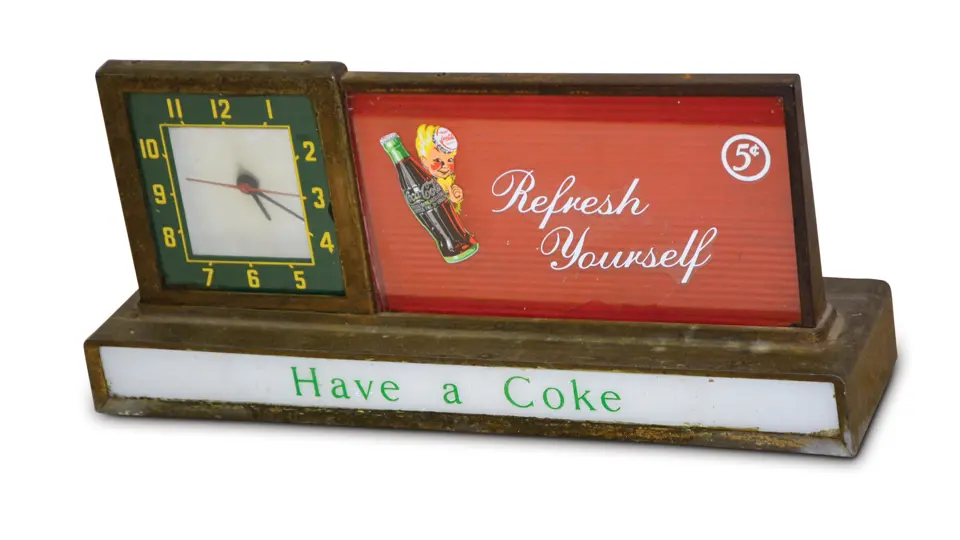 This is in good condition. It lights up and the clock works. The metal is dust stained and shows wear.