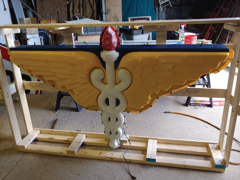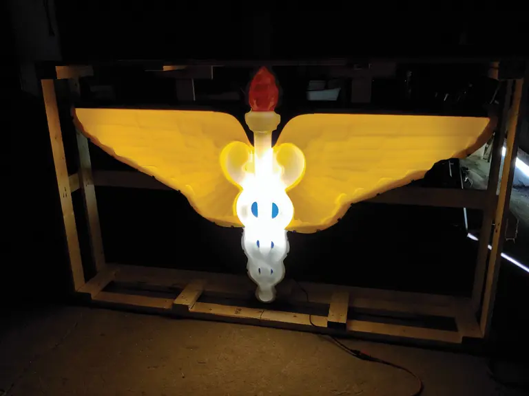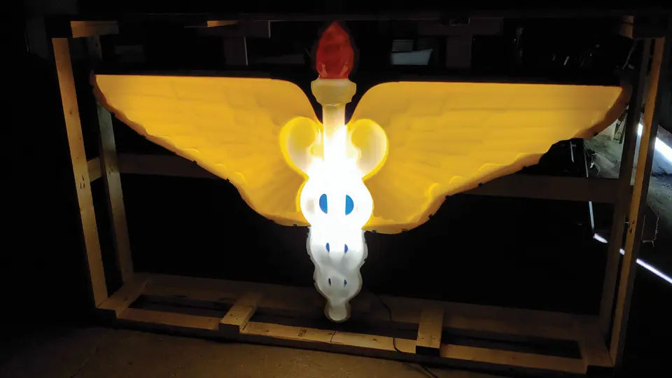 All embossed plastic pieces are in very good condition. One has a tiny edge chip. The color is good except for the top of the flame is slightly faded. Lights up. Crated.