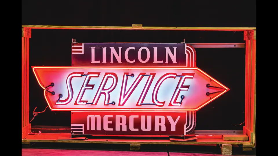 Two SSP diecut neon signs mounted back-to-back. They have good color and gloss with working neon. They are mounted on the original metal can which has been repainted. Crated.