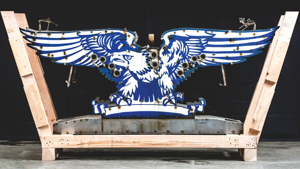 Two SSP diecut neon signs. It is weathered and stained. It is mounted on its original stainless steel can.