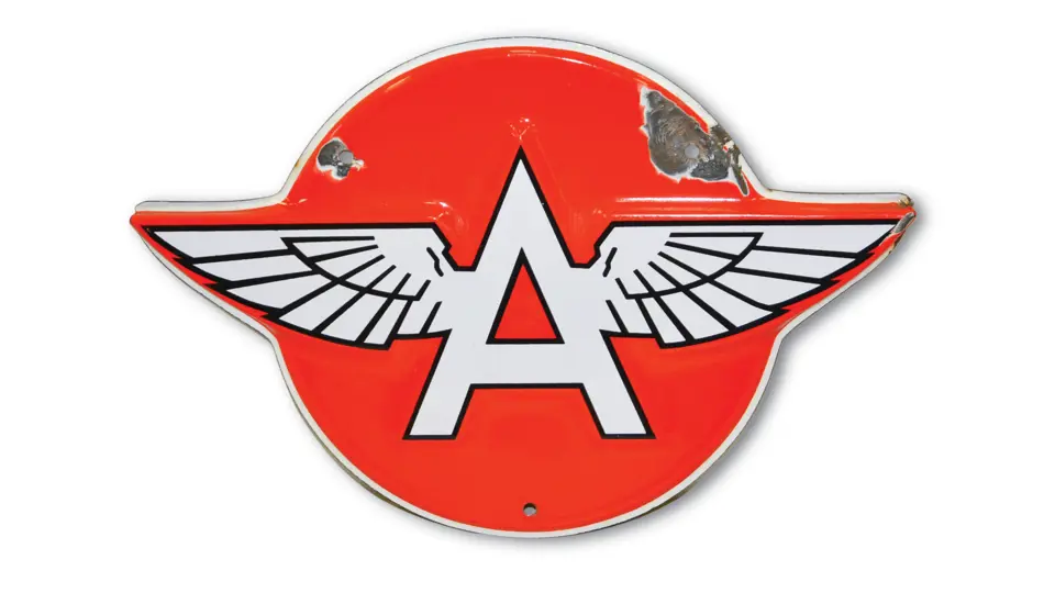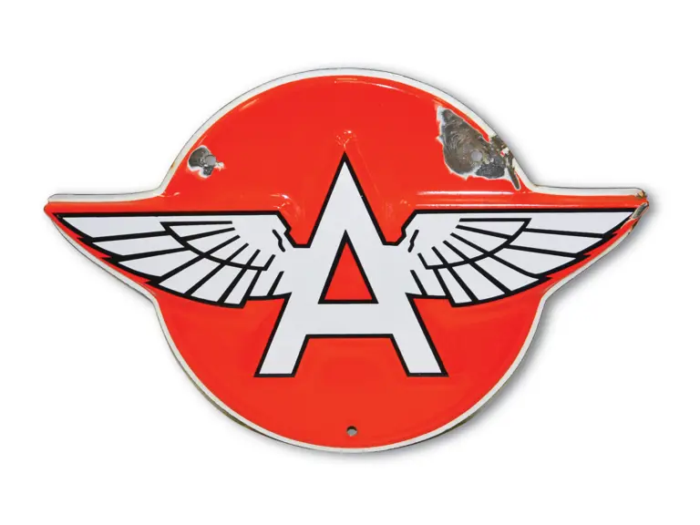 SSP diecut embossed sign. It has excellent gloss and color with large chip at outer mounting hole.