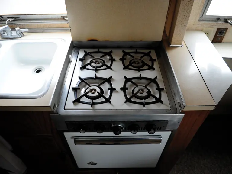 • Kitchen is equipped with sink, stovetop, oven, and refrigerator