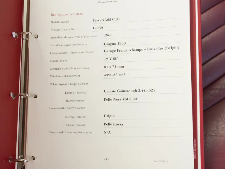 Based on these specs, the 365 was completed on December 24, finished in the unusual shade of Celeste Gainsborough (Gainsborough Sky Blue) and trimmed with a Nero Franzi (Franzi Black) interior. Completed as a European-specification model with instruments in kilometers, the car was dispatched in June 1969 to the well-known Belgian dealer Jacques Swaters, whose famous Garage Francorchamps sold some of the day’s best Ferraris. Indeed, an unusual piece of original documentation indicates that Mr. Swaters registered the car with a Certificate of Conformity on May 28, 1973.
