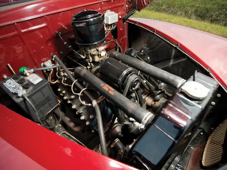 This Ford is finished in the appropriately titled hue of Coach Maroon, and its 25-year-old restoration has mellowed in the best possible way. It still exhibits an outstanding level of finish and detail, and it is better than it was in 1941. Under the hood, the correct hoses and clips are evident. Much of the body wood remains original, and all of it is varnished to a superb shine, with the inside of the body resembling the hull of a fine wooden boat. Most notably, the extensive blond wood paneling is particularly stunning, with several sections of figured maple in prominent areas. The original-type imitation leather interior is in superb condition, and the odometer shows 80,375 miles, which are believed to be original. The dashboard even contains an original radio and dash clock.