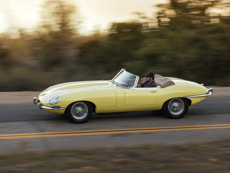 During 1963, Jaguar produced only 2,023 open two-seat roadsters, including this car, which is noted on its Jaguar Daimler Heritage Trust certificate as having been dispatched to the United States on July 4, 1963. Its original owner was J.P. Small of New York. Subsequent history is unknown until the 1990s, when it was acquired by a private collector and given a comprehensive restoration, completed in 1999, including a finish in the factory shade of Primrose Yellow. The color is striking against the brown leather interior and tan soft-top, as well as the chrome wire wheels shod in blackwall tires. The E-Type was eventually acquired by its present owner and is reported to still be beautifully finished and presented, as well as retaining its original matching-numbers engine.