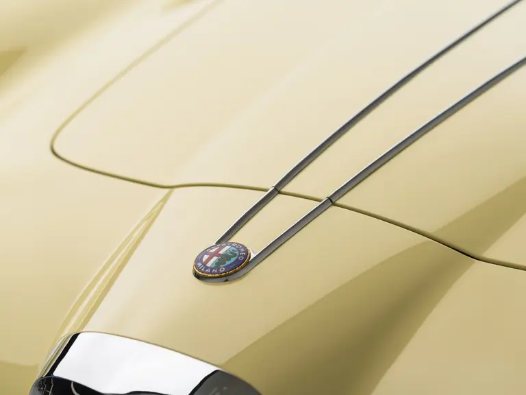 The design shows the influence of other futuristic show cars of the period, most notably the aerodynamic B.A.T. Alfas designed by Franco Scaglione for Bertone, and Touring’s famous 1900 Disco Volante (“Flying Saucer”). Its long, rounded curves are simple in their elegance, with classic “long hood, short deck” proportions set off by delicate chrome bumperettes and small round taillights. The curve of the greenhouse, with a B-pillar design that would later appear on Boano’s Ferrari bodies, was set off by a finish in black, contrasting to the creamy yellow of the lower body. Taken all together, the styling clearly speaks Alfa’s design language of the period, but in a more sensual voice. Accentuating its sporty pretensions, the car was fitted with a competition-style Tipo 1308 engine with large-diameter valves, a ram-type induction system of the type found on period Ferrari four-cylinder racing cars, and twin high-volume Weber 50 DCO3 carburetors, as well as a five-speed transmission.