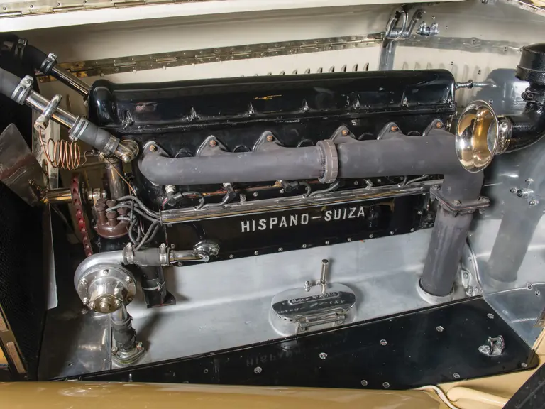 The Hispano-Suiza H6C offered here features coachwork by Hibbard & Darrin, the noted Paris coachworks established in 1924 by American expatriate designers Howard “Dutch” Darrin and Thomas Hibbard. Hibbard & Darrin’s most famous product was a four-door convertible dubbed the Transformable Torpedo, the hallmarks of which were a snug-fitting convertible top, which dropped in a “tent flap” to fill the space between the trapezoidal side windows, and a wide beltline molding also seen in other Hibbard & Darrin creations. This body design was utilized on numerous chassis, including the Rolls-Royce of actress Marlene Dietrich, and this particular Hispano-Suiza.