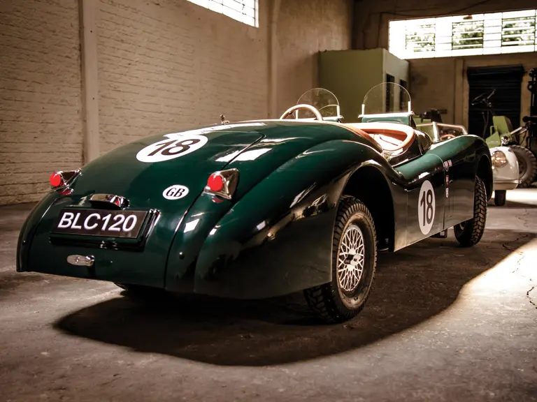 Offered is a delightful custom-built XK 120 that was designed to 2:3 scale of the original Jaguar sports car. It is powered by a 107 cc air-cooled, gasoline-powered engine and equipped with an electric start and semi-automatic transmission. The floor-shift transmission allows for three forward speeds as well as reverse. The diminutive Jaguar features rear brakes and a parking brake along with working doors with finished door panels, faux leather seats, functional lights and signals, as well as a horn. This unique reproduction is suitable for children as well as adults up to 6 ft. tall. This exceptional 2:3-scale XK 120 is sure to provide children and adults with many new memories.