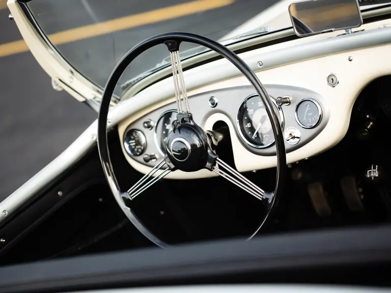 This wonderful 100-4 BN2, a left-hand-drive export model, was completed on 4 June 1956, according to its British Motor Industry Heritage Trust certificate. The Healey, which boasts its original color combination, was finished in two-tone paintwork of Ivory White and black, as well as a black interior and a black top. It was sold and delivered new through Hambro Trading Inc. of Los Angeles. The first owner tastefully chose optional extras which included a laminated windscreen, mph speedometer, and a heater. The current owner, recognizing the car’s significance, commissioned a full restoration in 2014. Upon stripping the paint, it was revealed that both the engine and boot compartment had been painted black, a known experiment by the factory and found only on white cars at the end of the BN2 production.