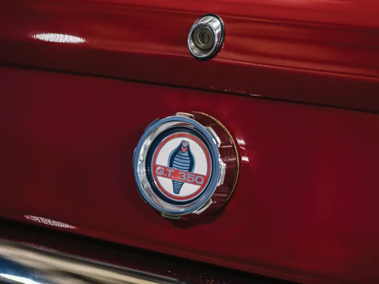 This ’66 Shelby GT350, chassis number SFM 6S1518, is finished sportingly from the factory in Candyapple Red. According to Shelby American Automobile Club’s Shelby Registry, it was shipped from the Shelby American assembly facility in Los Angeles, California, to Koons Ford in Falls Church, Virginia, in June 1966, then sold to its original owner on 26 July. Like all 1966 GT350s, it was delivered to Shelby American as a “K-code” Mustang fastback, then upgraded with a Cobra aluminum intake with Holley carburetor, Tri-Y headers, Koni shock absorbers, rear traction bars, 15-inch wheels, dash-mounted tachometer, competition seat belts, and wood steering wheel. Externally, the Shelby models differed from regular Mustangs with a fiberglass hood with scoop, Plexiglas rear quarter windows, and side scoops. Additionally, this car was ordered with the standard Le Mans stripe deleted.