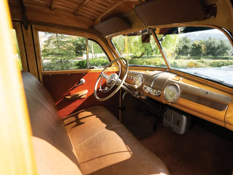Wood bodies featured white ash ribbing and birch over mahogany-look paneling fashioned by some 300 craftsmen at Ford’s Iron Mountain facility. The Super DeLuxe series was the top trim level and included chrome moldings around all windows, a horn ring, two sun visors, armrests on all doors, passenger assist straps, and horizontal chrome trim on the body.
