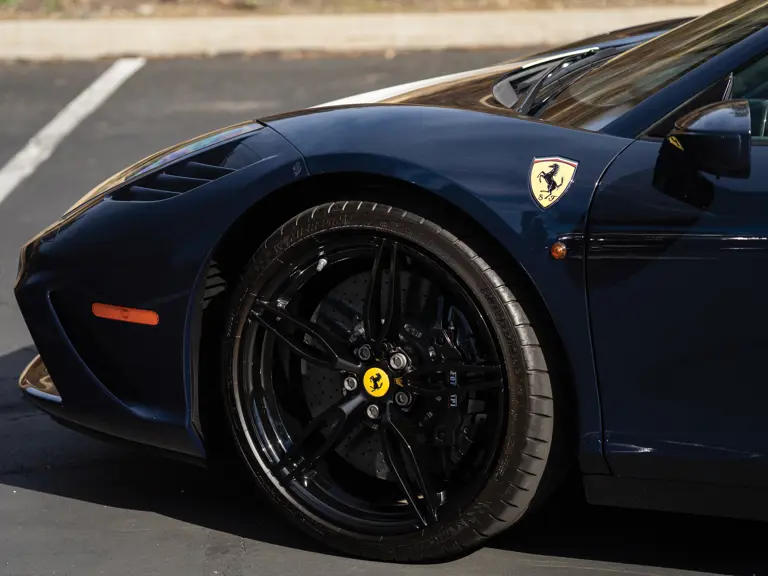 The Blu Pozzi example offered here features a white contrasting stripe and is one of just 499 458 Speciale Apertas ever built. Its black wheels sit in front of black brake calipers to give this most engaging of drop-top Ferraris a sinister look. This highly optioned example boasted a $410,000 sticker price when new and is equipped with a striking two-tone blue-and-black interior upholstered in Alcantara. The grippy fabric covers not just its seats but the top of its door panels, its center console, and its dashboard as well. What few pieces inside are not draped in Alcantara are composed of carbon fiber. The composite material is echoed on the car’s exterior as well as its engine cover. On their own, the extra optioned carbon-fiber panels constitute upwards of $30,000 on the car’s suggested price.