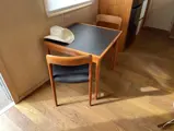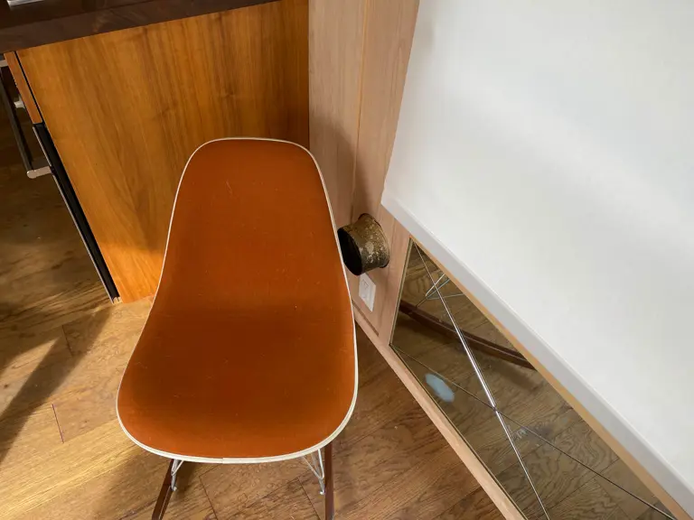 Perched upon a new set of wheels and tires installed November 2020, this Imperial Mansion is furnished with custom walnut cabinetry and countertops, stone bathroom flooring, midcentury lighting, a soaking tub, and Haier washer/dryer; a full suite of Dornbracht fixtures adorn the kitchen, bath, and sink. The living area features a period-style day bed, dining table, and Eames rocker; the entire cabin is well lit and features beautiful midcentury decorative touches. The sleek and modern renovation also supplied this trailer with new foam insulation fronted by wood walls and ceiling panels, while a Nest system governs the onboard heating and air conditioning systems.