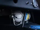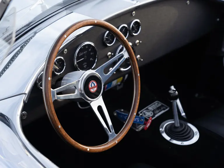 The interior is trimmed in black leather, with lap belts securing the driver and passenger; the driver benefits from a roll bar-mounted shoulder harness for more spirited driving. Behind the three-spoke Cobra-branded wood-rimmed steering wheel is a suite of Speedhut instrumentation, and a bottle for the onboard fire-suppression system sits below the dash.