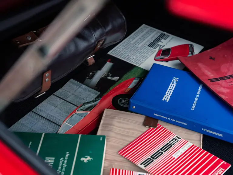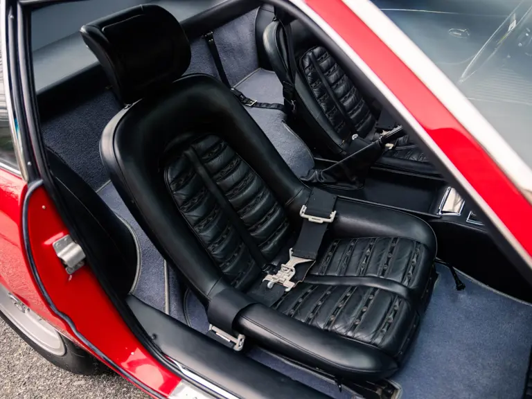 Today this Daytona presents as a largely original example while benefitting from a repaint in the stunning factory color of Rosso Chiaro. For the current offering the 365 GTB/4 has been mounted with Cromodora alloy wheels. A set of Borrani wire wheels are also included with the sale. This Ferrari retains stampings that confirm the continued presence of the matching-numbers chassis, engine, and transaxle, and the odometer displays a modest figure of just 29,146 miles at the time of cataloguing. Items accompanying the Daytona include a tool roll and owner’s manuals, SEFAC paperwork, registrations dating from 1971 to 1989, service invoices, and the Massini history.