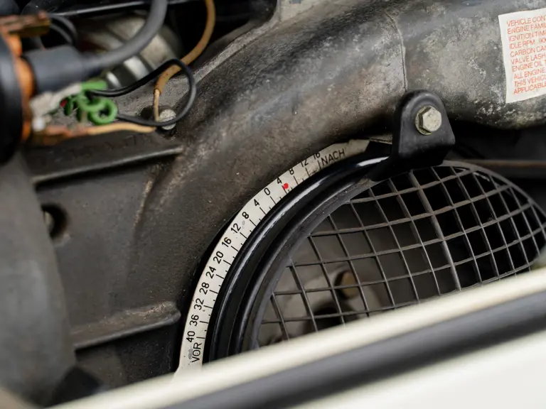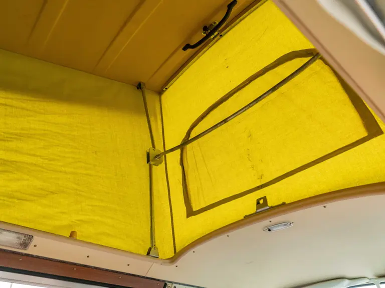 This Type 2 Westfalia Campmobile 70 is said to have been restored to factory specifications in the late Nineties and received a bare-metal respray to its current shade of white. As shown on the trim tag, the bus features the Westfalia pop-up roof (073), detachable headrests, (507) vent wings in cab