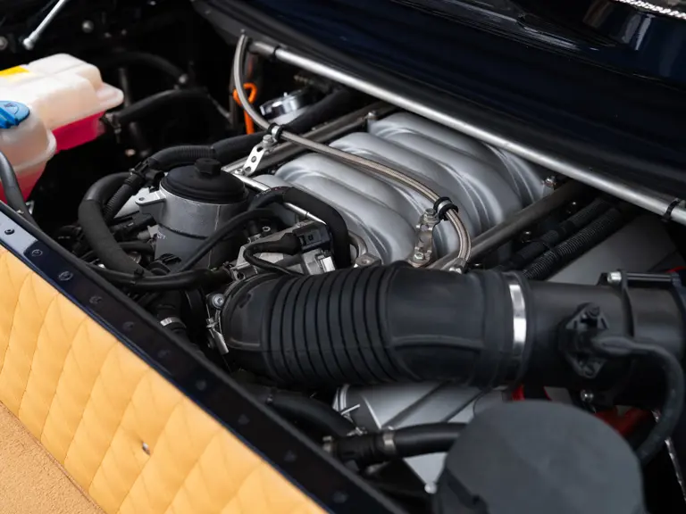 The Spyker C8 Spyder debuted at the Birmingham Motor Show in 2000 and was a complete stylistic departure from anything that preceded it. Design elements throughout paid homage to the company’s automotive and aeronautical legacy, most notably its aluminum spaceframe construction, fuselage-like styling with rear “cannon-port” vents and a prominent grille intake, and “Aeroblade” wheels with propeller-shaped spokes. The interior featured an intricate engine-turned dashboard fascia and backlit, chrome-bezeled gauges, as well as an open shift gate, a billet-machined pedal box with exposed linkages, and rows of toggle switches mimicking an airplane’s instrument panel. Underneath was a racing-bred chassis with double-wishbone fully independent suspension, a six-speed Getrag transaxle, and a 400-horsepower, 4.2-liter Audi V-8 engine.