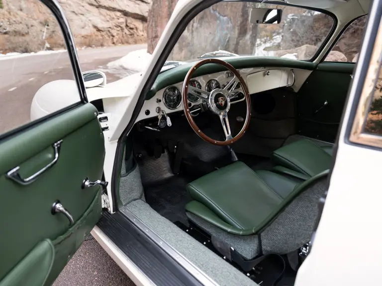 Renowned for their custom metalwork, Emory’s team finished the body in period-correct Light Ivory after deleting the bumpers and front hood handle, as well as adding a louvered deck lid with stainless mess grill, flip-over deck lid hinges, a GT-style mirror, competition fuel filler, and hand-painted Mobil Oil Pegasus logo on both front fenders. The cabin features Green Vine leather upholstery on Speedster-style seats with carpeted seat backs, light green German square-weave carpet, a bolt-in roll cage, deleted rear seat with leather luggage straps, a three-spoke Moto Lita wood steering wheel, and unique wooden shift knob with engraved heraldic eagle. Electric air conditioning and a Stealth Bluetooth module have also been incorporated to further driver enjoyment.