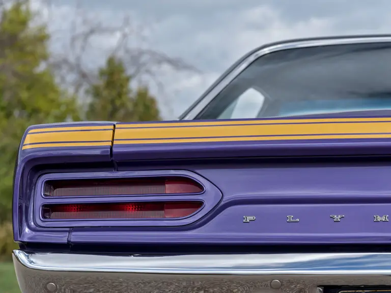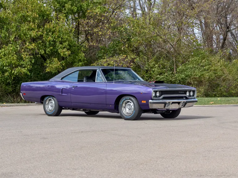 Presented for sale for the first time since 1973, this 1970 Road Runner has remained under the careful ownership of a single family for over five decades. Assembled on 14 November 1969, this code FC7 In-Violet purple Road Runner rolled out of Chrysler’s St. Louis plant with an extraordinary set of factory equipment, including the legendary 440-cubic-inch Six-Pack V-8 engine with its trio of Holley carburetors, a heavy-duty four-speed manual transmission with "pistol grip" shifter, a Super Track Dana 60 rear axle with 4.10:1 gearing, 26-inch heavy-duty radiator, power brakes, and the highly desirable Air Grabber hood.