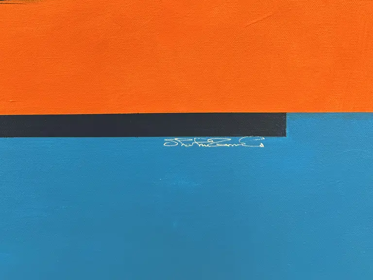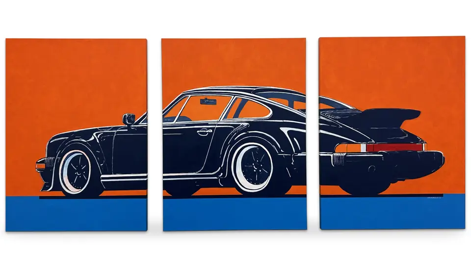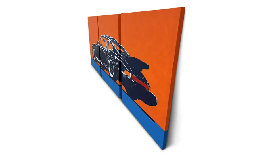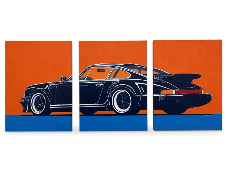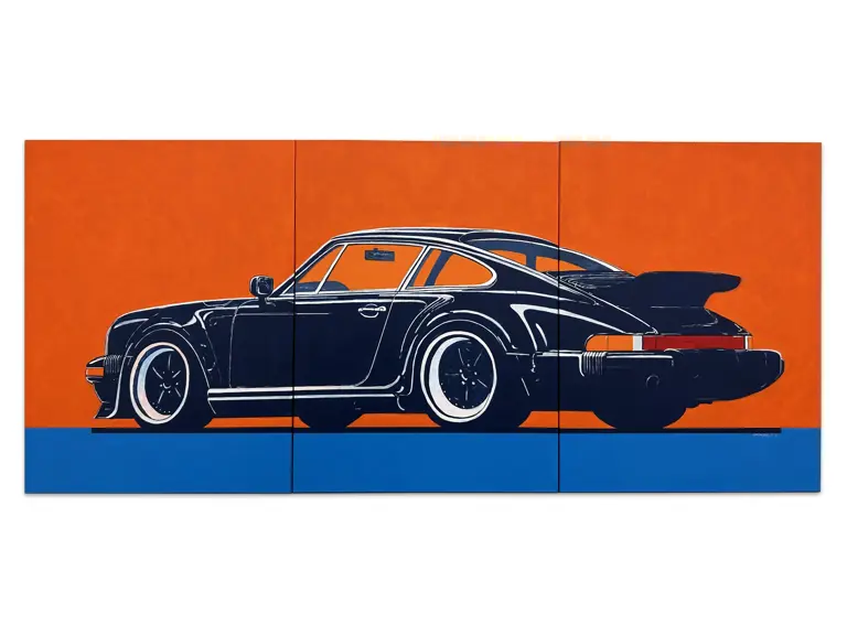In this striking large-scale triptych, contemporary artist Shahin Zonoozi reimagines the iconic type 930 Porsche 911 Turbo through a bold graphic lens. Rendered in deep midnight tones against a vivid orange field, the car’s silhouette becomes sculptural, emphasizing the aerodynamic purity of the 930’s legendary form. Precise line work, controlled highlights, and disciplined geometry reflect Zoonozi’s background in engineering and design, while the saturated palette gives the piece an unmistakably modern presence. “The triptych format creates a sense of reverence, as if the car becomes a modern relic,” Zonoozi says. Each of the three panels measures 36 inches by 48 inches for a combined measurement of 9 feet by 4 feet.
