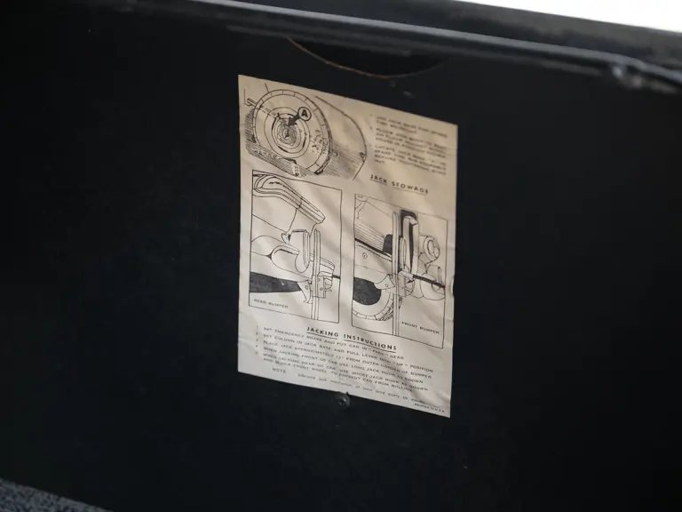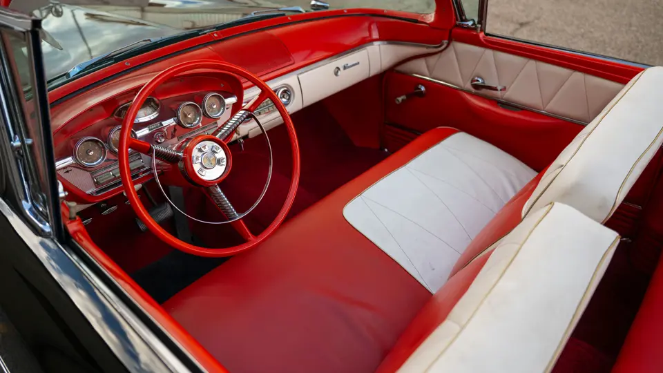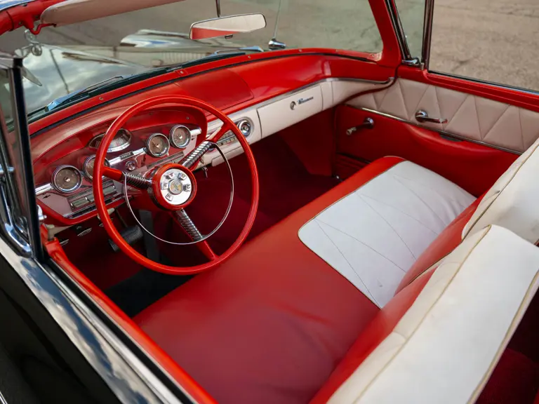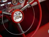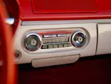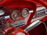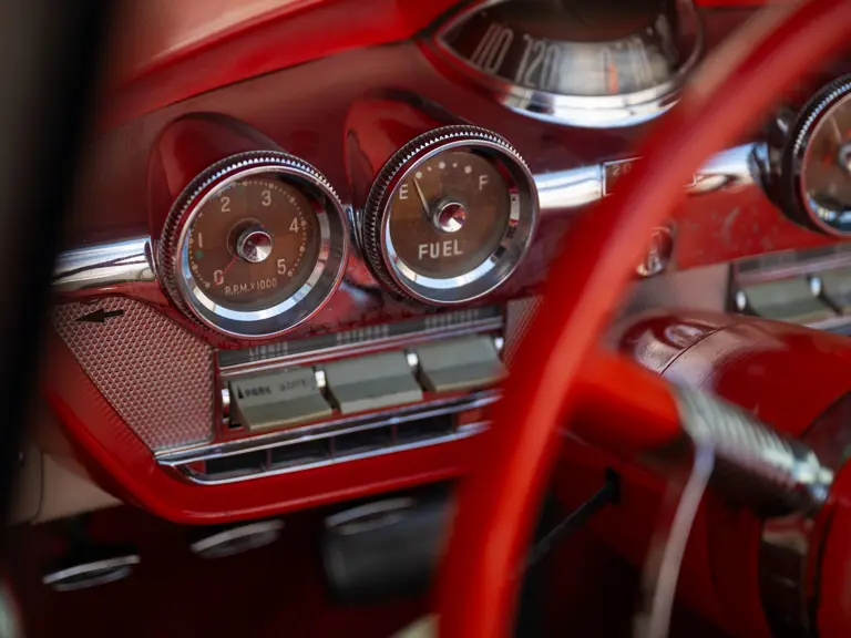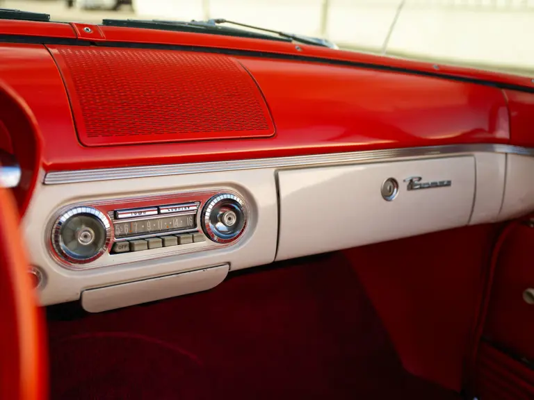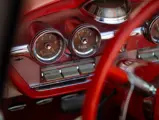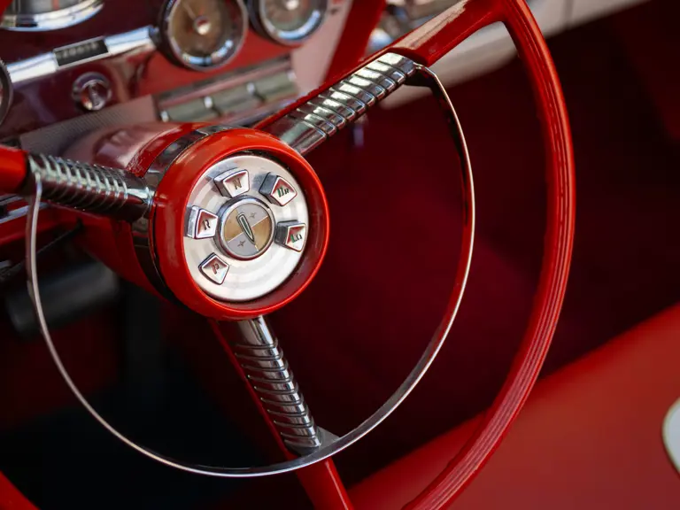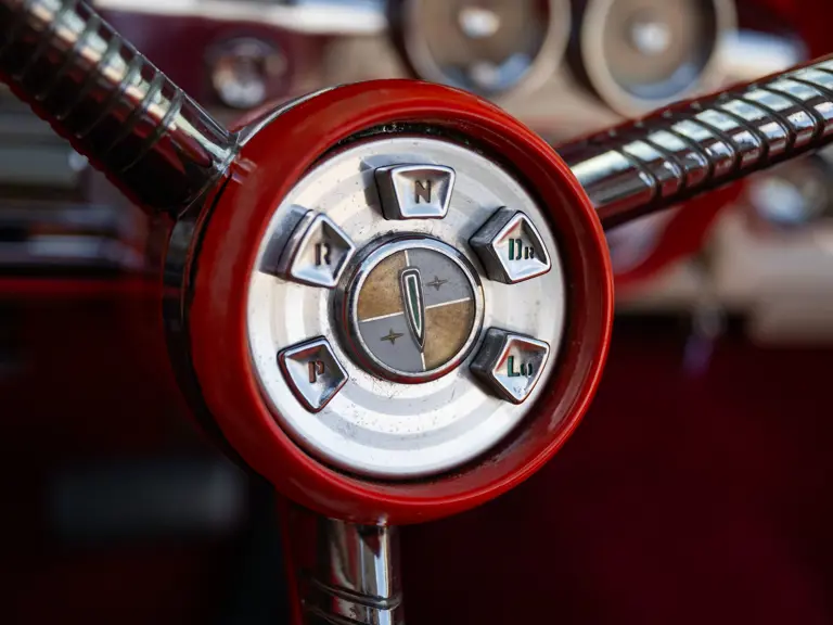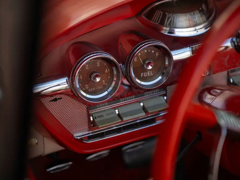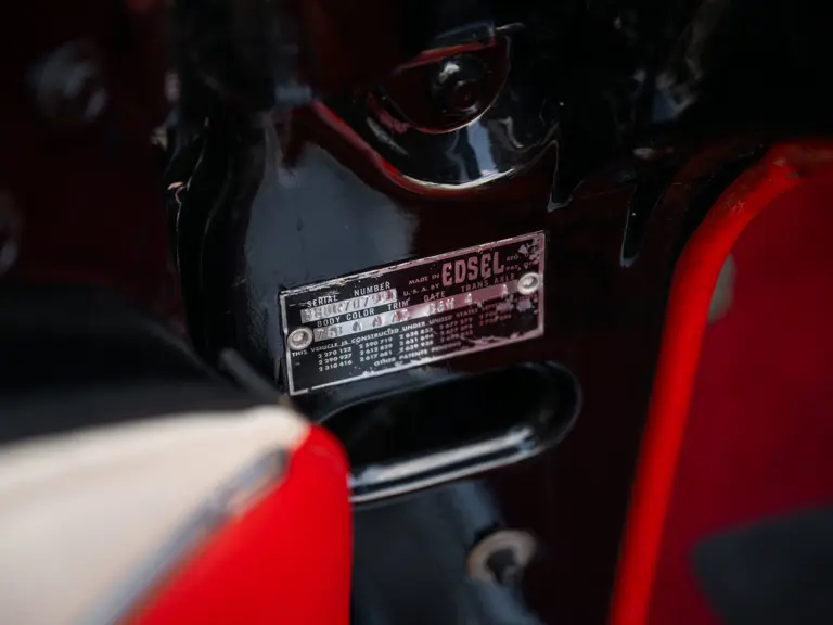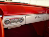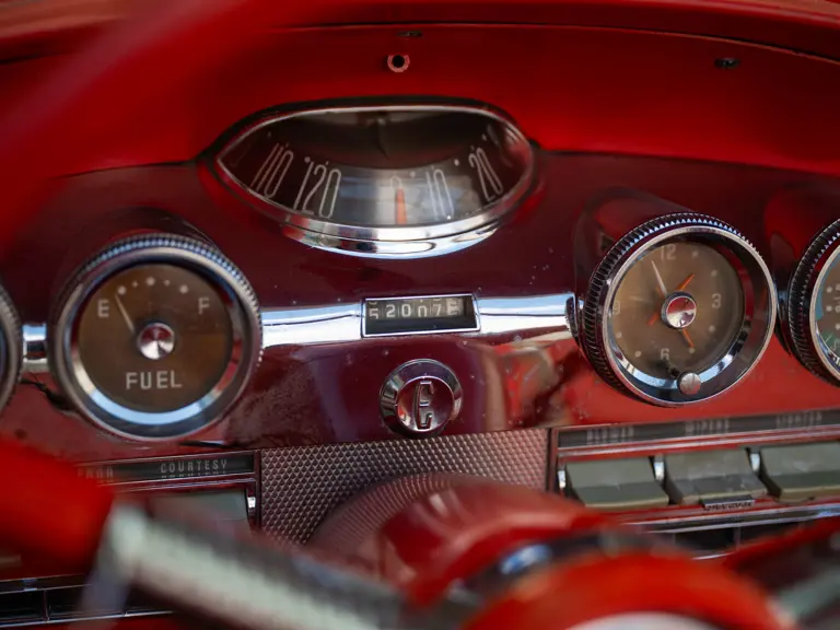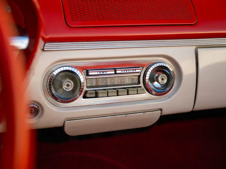 The red and white two-tone interior features buzzworthy Edsel novelties, including a “rolling dome” speedometer and Teletouch Drive with selector buttons in the steering wheel hub to operate the automatic transmission. A signal-seeking AM radio, optional tachometer, clock, compass, fender-mounted sideview mirrors, and wide whitewall tires mounted on steel wheels with covers all illustrate just how well-equipped Pacers left the factory.